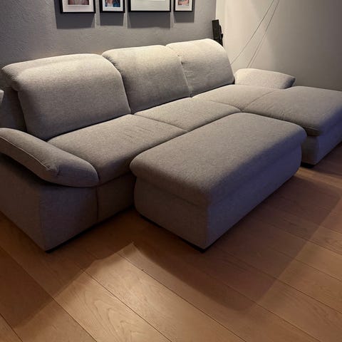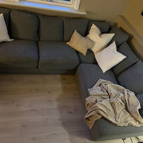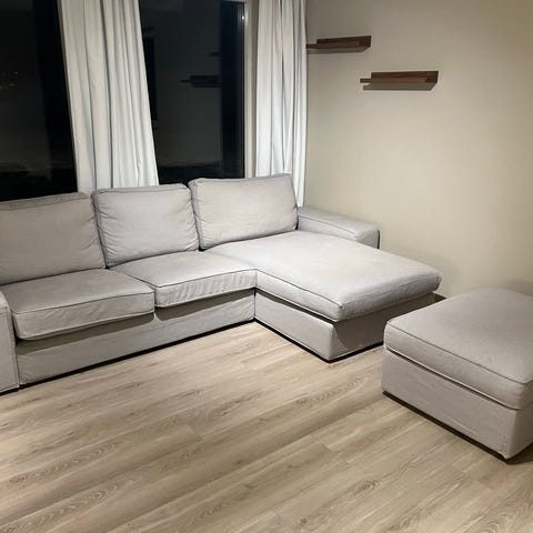 Pent brukt sofa selges, god sittekomfort. Lengde 220cm, høyde fra gulv til sete 42cm, dybde 90cm. Avtagbare trekk på både sitteputer og ryggputer. Følger med puff fra samme serie, mål: 92x62. Høyde: 43 cm.