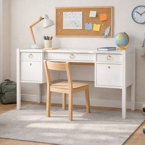 Musterkind barnesminkebord i rosa med integrert speil og to skuffer med stjerneutskjæring. Bordet har en hylle under skriveflaten for ekstra oppbevaring. Passer til barn og kan brukes til lek og skolearbeid.