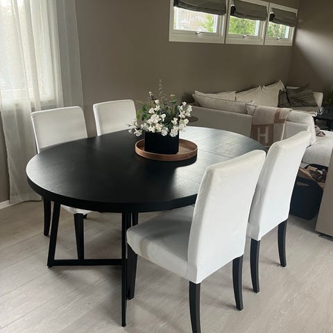 Stilig spisegruppe med 6 gode stoler. Som ny, bare 2 måneder gammel. Selges på grunn av plassmangel.