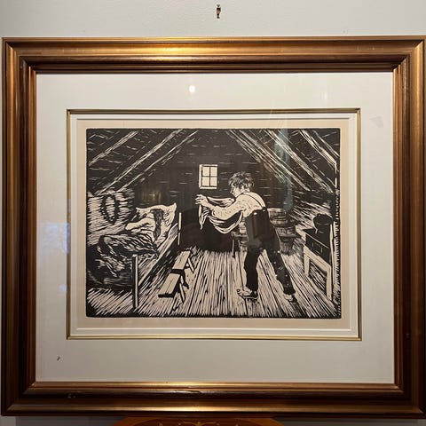 Veggbilde med portrett og neonmotiv