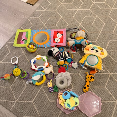 Fisher-Price leketøysett som inkluderer flere myke figurer med ulike funksjoner. En av lekene har musikkfunksjon og håndaktiverte knapper, designet for små barns lek og læring.