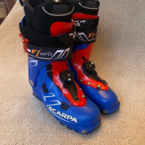 Scarpa F1 randonnésko i størrelse mondo 28, som tilsvarer ca. størrelse 43-44.