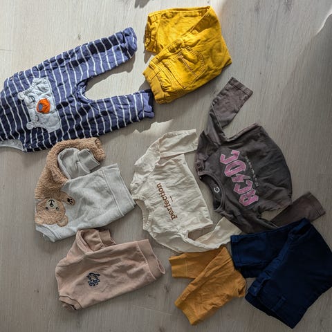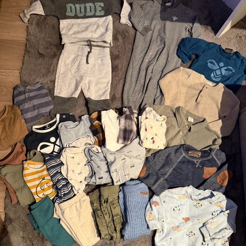 Mix av forskjellige barneklær i størrelse 74/80 for unisex. Plaggene har flere farger og mønstre, egnet for små barn. Materiale er bommul klær .