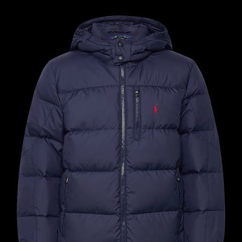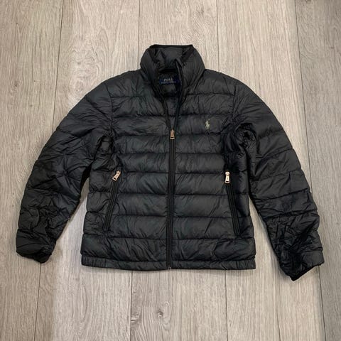 Original Polo Ralph Lauren dunjakke til barn i mørk blå med rød logo og rødt fôr.