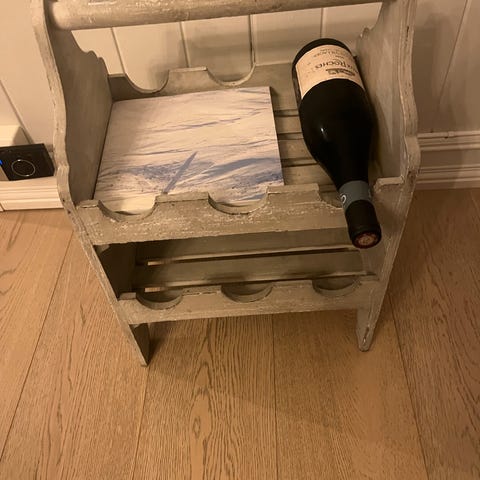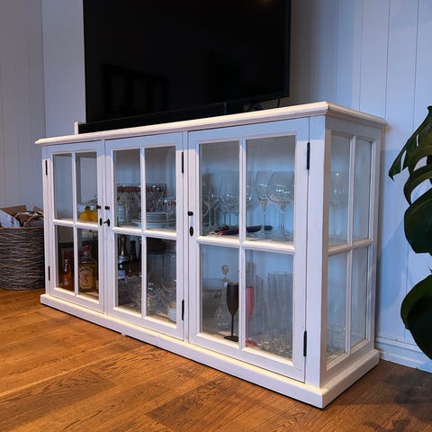 Opprinnelig hvit Sjenk som er malt om i to omganger og har nå en hvit/grå farge. Trenger et nytt strøk for at den skal bli like fin igjen. Innvendig original mørk farge. Allsidig Sjenk vi har hatt mye glede av. Hentes på Hosle i Bærum.