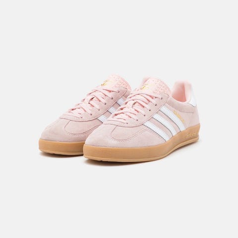 Adidas Gazelle sneakers joggesko i størrelse 40. Skoene har en kombinasjon av lyse og mørke farger med klassiske tre striper på siden. Designet for hverdagsbruk og fritid.