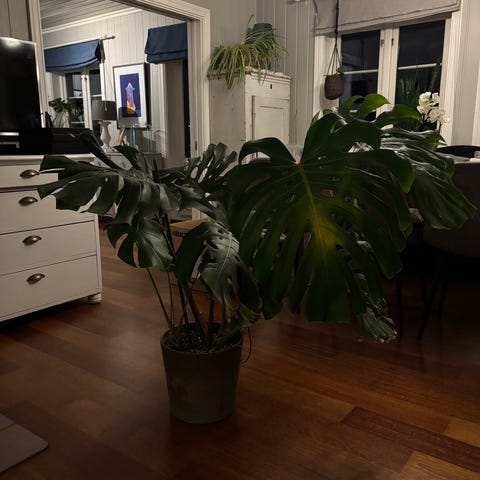 Monstera Deliciosa stueplante med store grønne blader. Planten er egnet for innendørs bruk og krever moderat lys og vanning. Den har karakteristiske flikete blader som gir et tropisk preg til rommet.