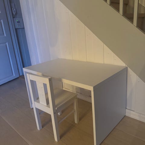 Skrivebord med tilhørende stol. Trenger et malingsstrøk og at skruene tightes litt til, ellers helt fint.