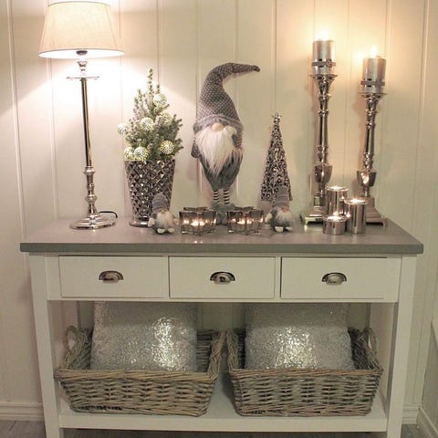 Konsollbord, benk med skuffer og knaggrekke/hattehylle.