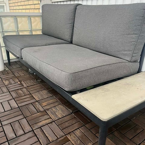 Utesofa med oppbevaringsrom under setet selges. Det følger med tre puter. Selges da vi flytter til sted uten uteplass. Perfekt for balkong!