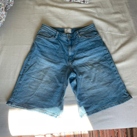 Dongerishorts fra Fravunit i størrelse 31. Klassisk blå denim med lett slitasjedetaljer som gir et tøft uttrykk. Komfortabel og anvendelig