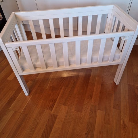 JLY Bedside crib barneseng i hvit farge. Barnesengen er designet for å plasseres ved siden av foreldreseng og gir enkel tilgang til barnet. Laget i tremateriale med spiler på alle sider for sikkerhet og ventilasjon. To høydejusteringer.