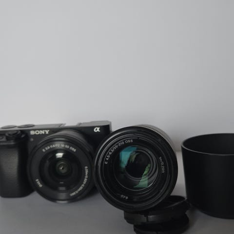 Sony A6500 inkludert Sigma 30mm f/1.4 (med Hoya UV-filter), 2 batterier (uoriginale) og kameraveske.