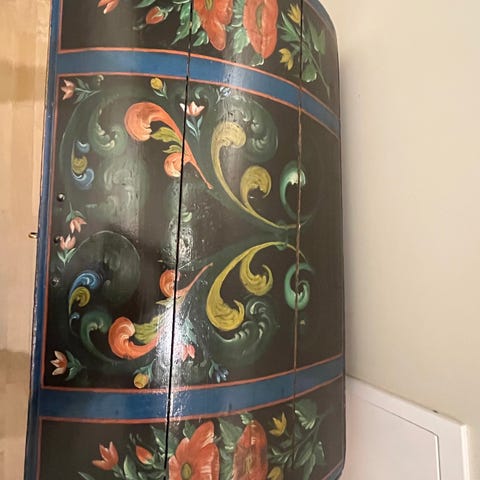 Antikk kiste i tre med jernbeslag, datert år 1807. Kisten har håndmalte dekorasjoner og tekst på fronten, samt solide jernhåndtak på sidene. Passer til oppbevaring eller som dekorativt møbel.