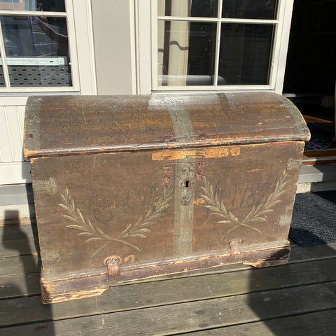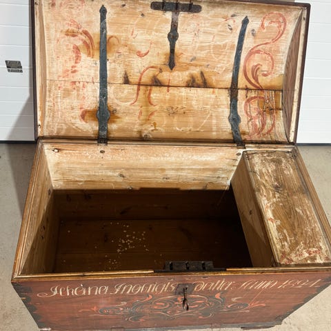 Antikk kiste fra 1807, i tre med jernbeslag