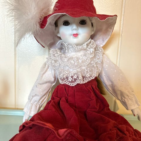 Dukke med langt krøllete hår, iført en blomstrete kjole i røde og grønne farger, samt hvite sko. Dukken har bevegelige armer og ben og er egnet som samleobjekt eller til lek.