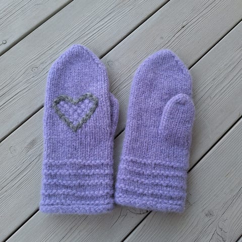 Tovede Hjertevotter strikket i 100% ull (Fritidsgarn) selges for 250 kr pr par.
