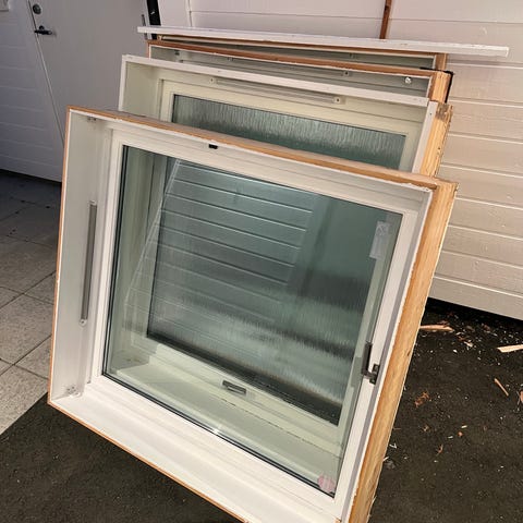 Vindusrammer med glass i ulik størrelse. Rammene er laget av tre og har hvit farge. Passer til bruk i boliger eller andre bygg hvor utskifting eller montering av vinduer er nødvendig.