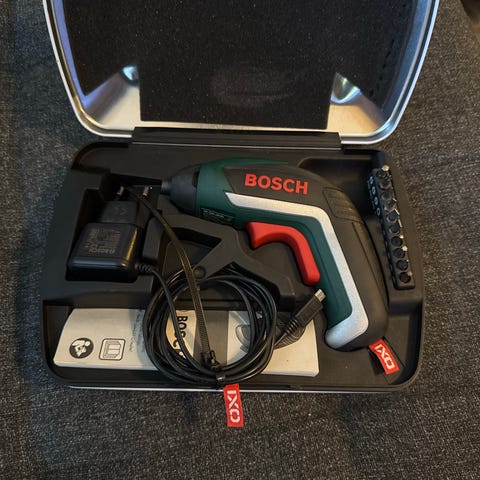 Bosch elektrisk skrutrekker med lader. Produktet inkluderer en håndholdt skrutrekker med strømkabel og en separat lader. Passer til diverse monterings- og reparasjonsoppgaver.