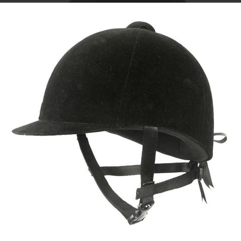 Pent brukt ridehjelm i størrelsen 50-52, XS. Den har fine justerbare stropper rundt haken, i tillegg til stramming rundt hodet, bak på hjelmen. Velur på utsiden og alt sløyfe detalj bak, og innebygget rom for «hår-dott» inne i hjelmen. Får med hjelm pose og ride-sekk på kjøpet om ønsket🥰