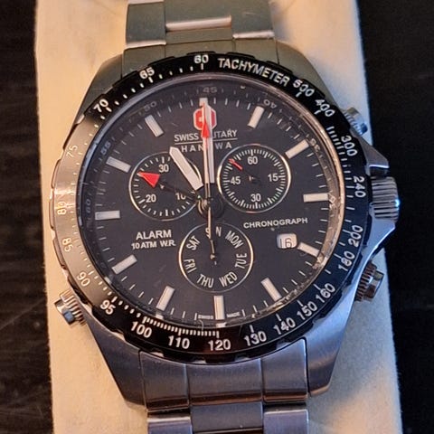 Blå/blå Swiss military hanowa kronograf selges, denne er meget pen. Digger å bruke den, men blir for sjelden.
