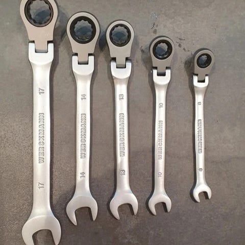Ubrukt Skrallenøkkelsett med forskjellige funksjoner.