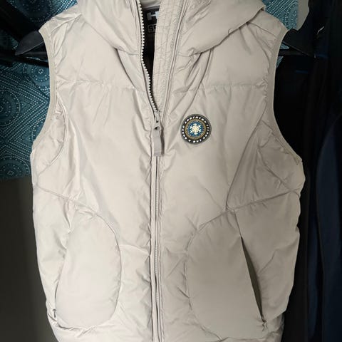 Dunvest fra H2O Fagerholt med toveis skjult glidelås, samt en bred elastikk midjen. Vesten er lite brukt. Str S. Nypris er ca 2199 kr. Et lite merke som er lite synlig. Det er en linen blank flekk på et par millimeter. Se siste bilde. Vanskelig å få det til å synes på bildet. Selges av den grunn billig.