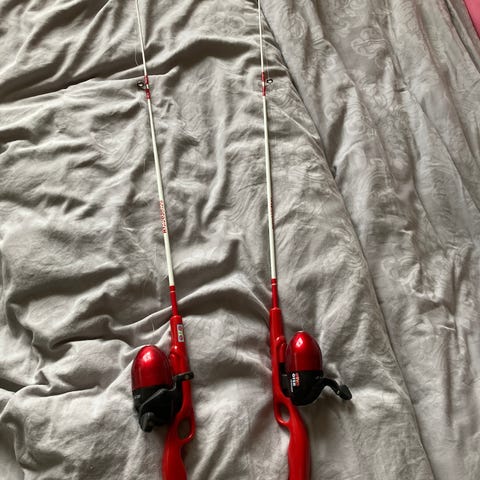 Tre fiskestenger til salgs. To for isfiske og én for sportsfiske.