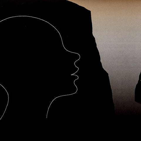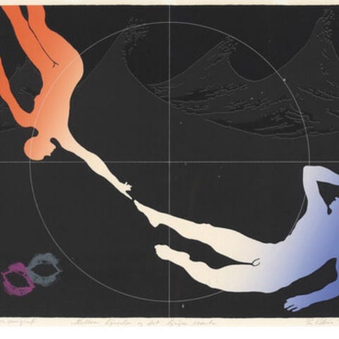 Litografi kunstverk med signatur og nummerering 28/200. Trykket viser to figurer i kontrastfarger mot svart bakgrunn, innrammet i en hvit og sølvfarget ramme.