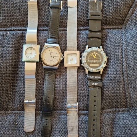 Lot Gamle klokker 5 stk, trenger nye batteri og eller nye reimer, selges HBO 500 .- samler eller enkeltvis hbo 100.- for den sorte og sølvfargede, de 3 andre 75.- pr stk. Oppgjør på Vipps Sender i post mot porto. (Sender gjerne flere bilder på forespørsel)