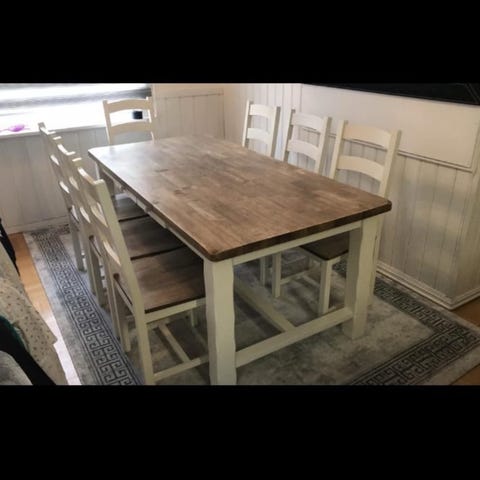 Spisebord med 6 stoler gis bort mot henting. Bruksmerker, men ellers god stand. Ønskes hentet så fort som mulig.