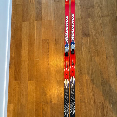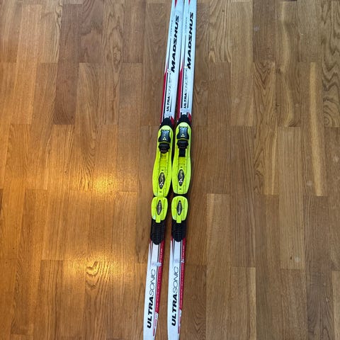 Madshus Ultrasonic skate jr. med lengde på 140 cm. Skiene har Rottefella bindinger. Pent brukt.