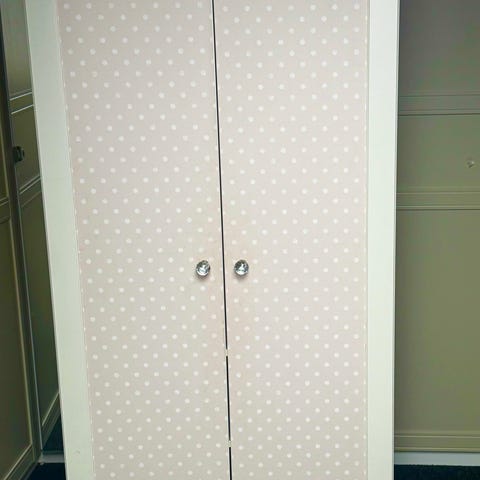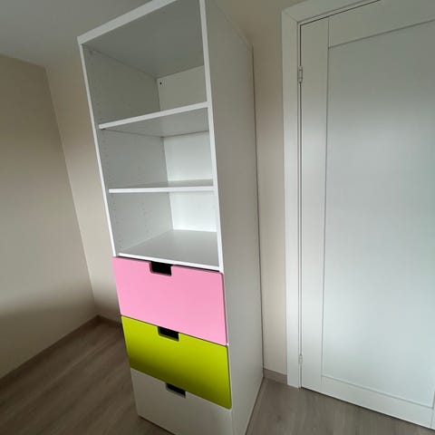 Pent brukt kommode til barn med fem uttrekkbare trådkurver og en uttrekkbar del med hengeplass til klær inkludert kroker. Det er også en liten skuff i topp på uttrekkbar del i toppen, samt bunn er super til lagring av diverse. Kommoden har ikke hatt påskrudde håndtak, disse kan derfor flyttes hvor en måtte ønske uten at det er noe hull.