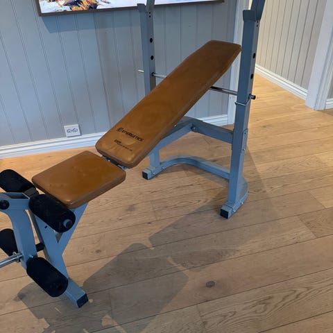 Utstyrt med polstrede seter og ryggstøtte, håndtak og vektstativ.