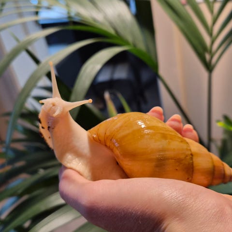 Vår datter ønsker å selge sine ett år gamle Afrikanske kjempesnegler. Du får også med buret vi har laget, hvis du vil.