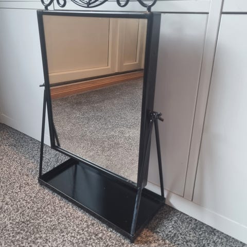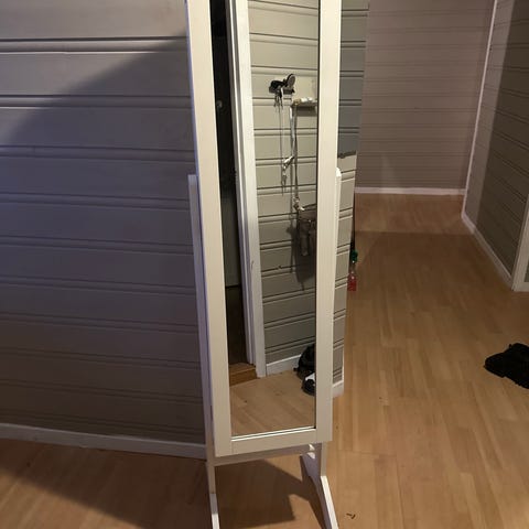Hvitt pent brukt sminkespeil med lys som går på strøm. Har støtte bak men kan også henges opp.