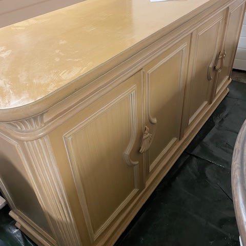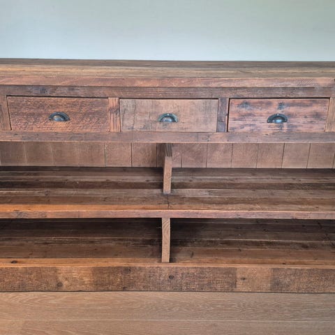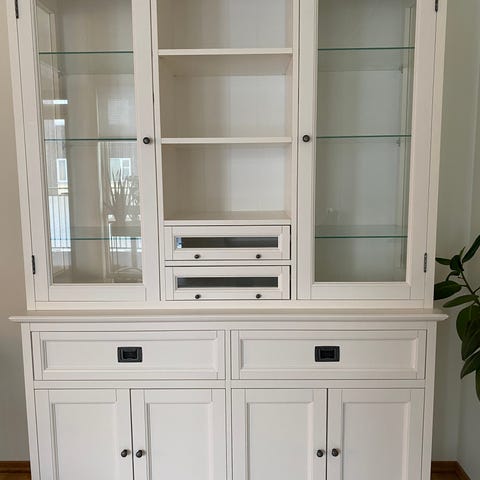 Skjenk fra Home and Cottage kjøpt i 2017. Kan demonteres i to deler for frakt. Ingen skader, men noe slitasje på siden som på ene bildet. Ellers vanlig platina som ved andre møbler fra home and cottage. Store skuffer og god plass i skap fordi det er åpent mellom dørene.