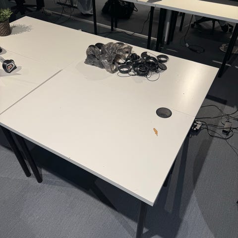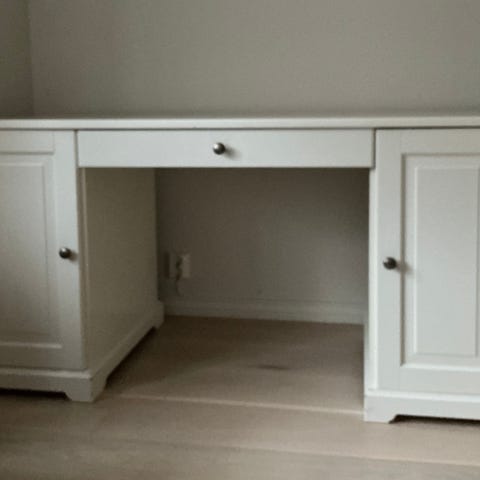 Perfekt for små rom/hybler. Magnetisk whiteboard tavle på siden. Bærer preg av bruk og flere flyttinger samt siste års støvsamling. Mangler fester for de løse delene som vises på bilder. Men er stabil uten disse. Hyllen under tavla sitter ok med bare trepluggene, men må demonteres litt for å få den på.