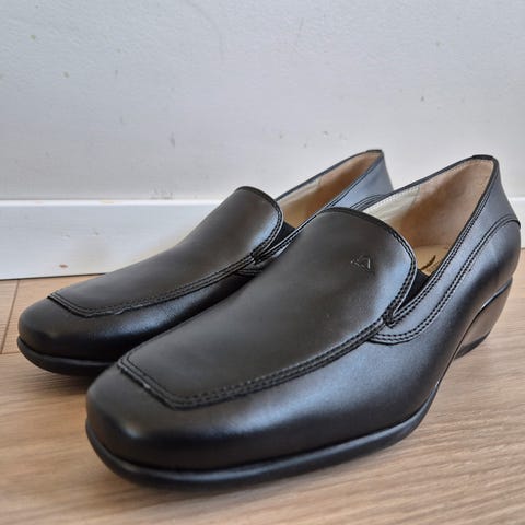 Klassiske svarte støvletter i skinn i størrelse 40. Støvlene har glidelås på innsiden. Designet med en lav, bred hæl og rund tupp. Minimalt brukt.
