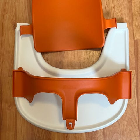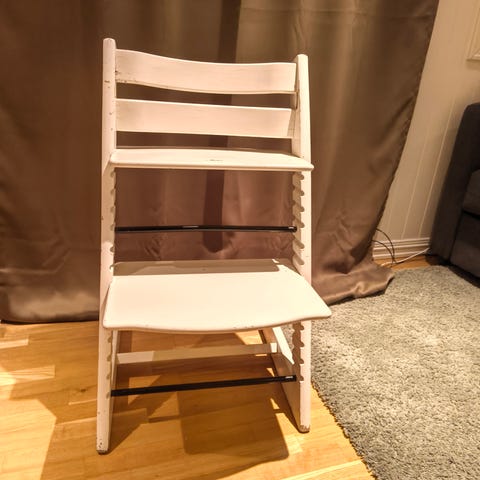 Pent brukt Stokke høy barnestol i tre med justerbare sitte- og fotplater. Designet for barn, gir støtte og komfort ved måltider og aktiviteter ved bordet. Naturlig tresort med sikkerhetssele for ekstra trygghet.