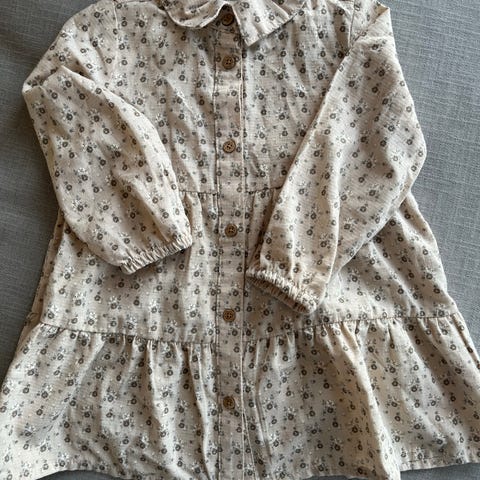Lil'Atelier barnekjole i størrelse 86. Kremhvit/beige med jordbærmønster. Den har korte ermer og knappelukking på skulderen, og body under.