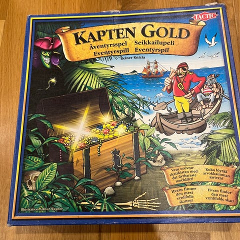 Captain Flip brettspill med tema sjøeventyr og pirater. Inneholder spillbrett, brikker og kort med illustrasjoner av kaptein, skip, sjømonstre og andre karakterer. Passer for flere spillere og kan brukes til underholdning hjemme eller med venner.