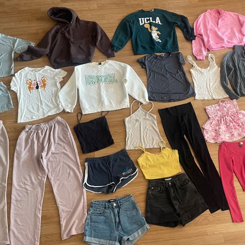 Masse klær som er prøvd på bare en gang eller brukt bare en gang. Alt i xxs-s i størrelse. Brukt av samme person så alt er ca tilsvarende xs-s. For det meste overdeler, croptops, en shorts og ei bukse brukt en gang. Til sammen 21 plagg, selges samlet. Har bare ligget oppbevart i skap