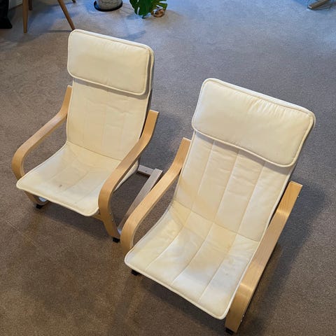 To stk ikea lenestoler til barn selges. En er pent brukt uten synlige skader og en har noen riper på armlenene, som kan pusses bort om ønskelig. Trekk kan følge med om ønskelig, men har noen flekker. 200 for 2 stk eller 150 for en.