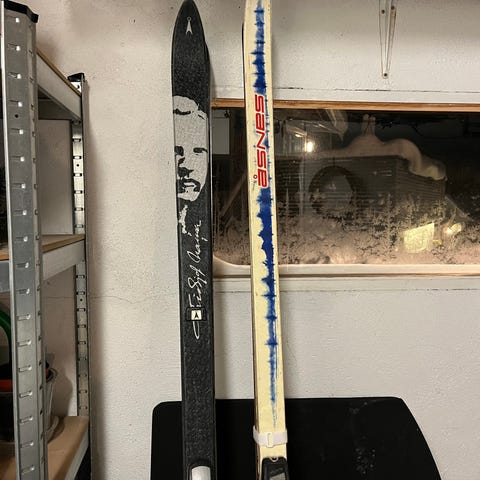 Flere par ski fra ulike merker med monterte bindinger. Pris kan diskuteres.