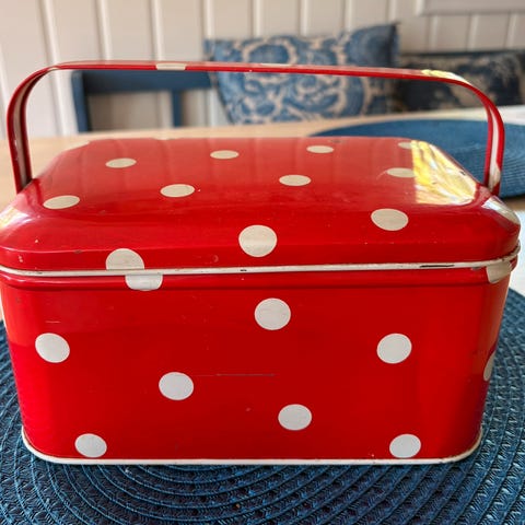 Dette er en eldre original kakeboks, ikke reproduksjon.