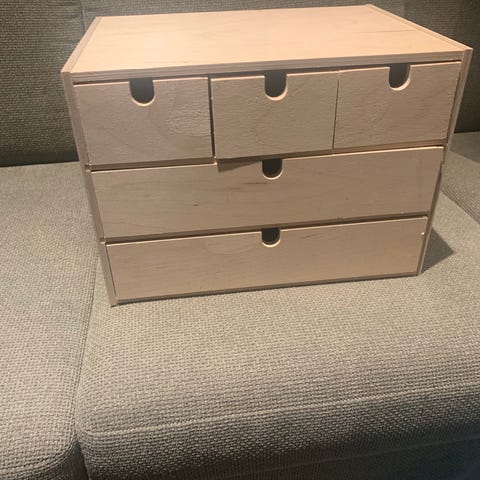 Selger en pent brukt IKEA Moppe minikommode i ubehandlet bjørk kryssfiner. Dette er en svært praktisk og dekorativ oppbevaringsløsning som er perfekt for å organisere småting på kontoret, hobbyrommet eller i gangen.