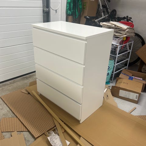 Godt brukt, har stått i innendørs bod. En spiker viser i ene skuffen, en planke mellom to skuffer mangler. Se bilder.