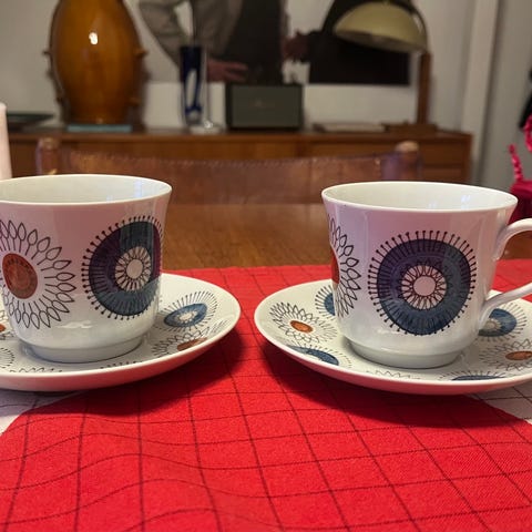 Selger fire flotte kaffekopper i serien Figgjo Valencia. Nydelig dekor, veldig fin stand!