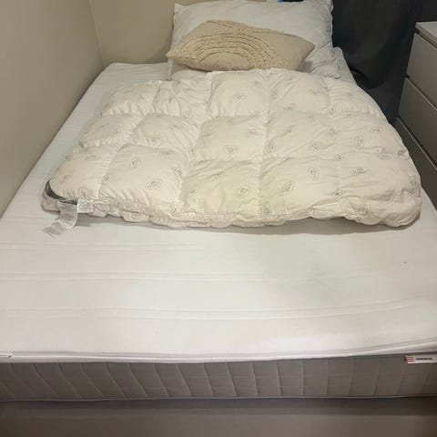 Sengen har en lys ramme i tremateriale og inkluderer madrass. Passer til soverom og gir mulighet for individuell tilpasning av liggekomfort.